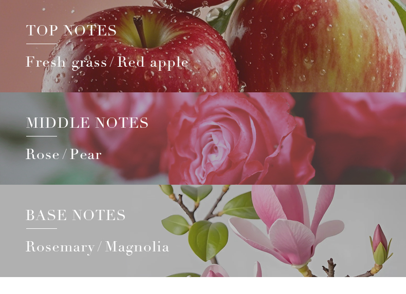 Smell: grass, red apple, rose, pear, rosemary, magnolia